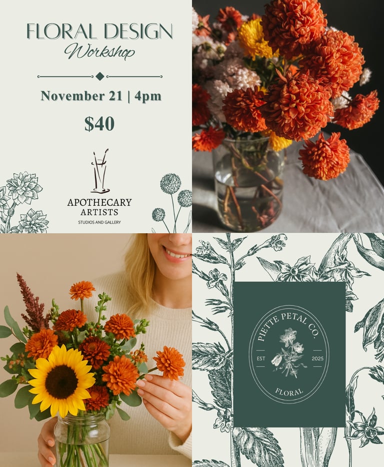 Join us for a Fall Mason Jar Floral Design Class on November 21 at 4PM, hosted by Piette Petal Co. and Apothecary Artists and Gallery in their dreamy Southborough, MA studio + gallery space.